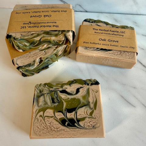 Handcrafted using traditional cold process methods, this artisanal soap harnesses the soothing properties of natural glycerin. Rich in Shea butter and cocoa butter, this soap delivers a gentle cleanse that respects your skin's natural balance. Oak Grove is not only pretty. It has a beautiful fresh scent, loved by everyone. This blend is a wonderful mix of White oak, Vanilla, Tonka and Oud.