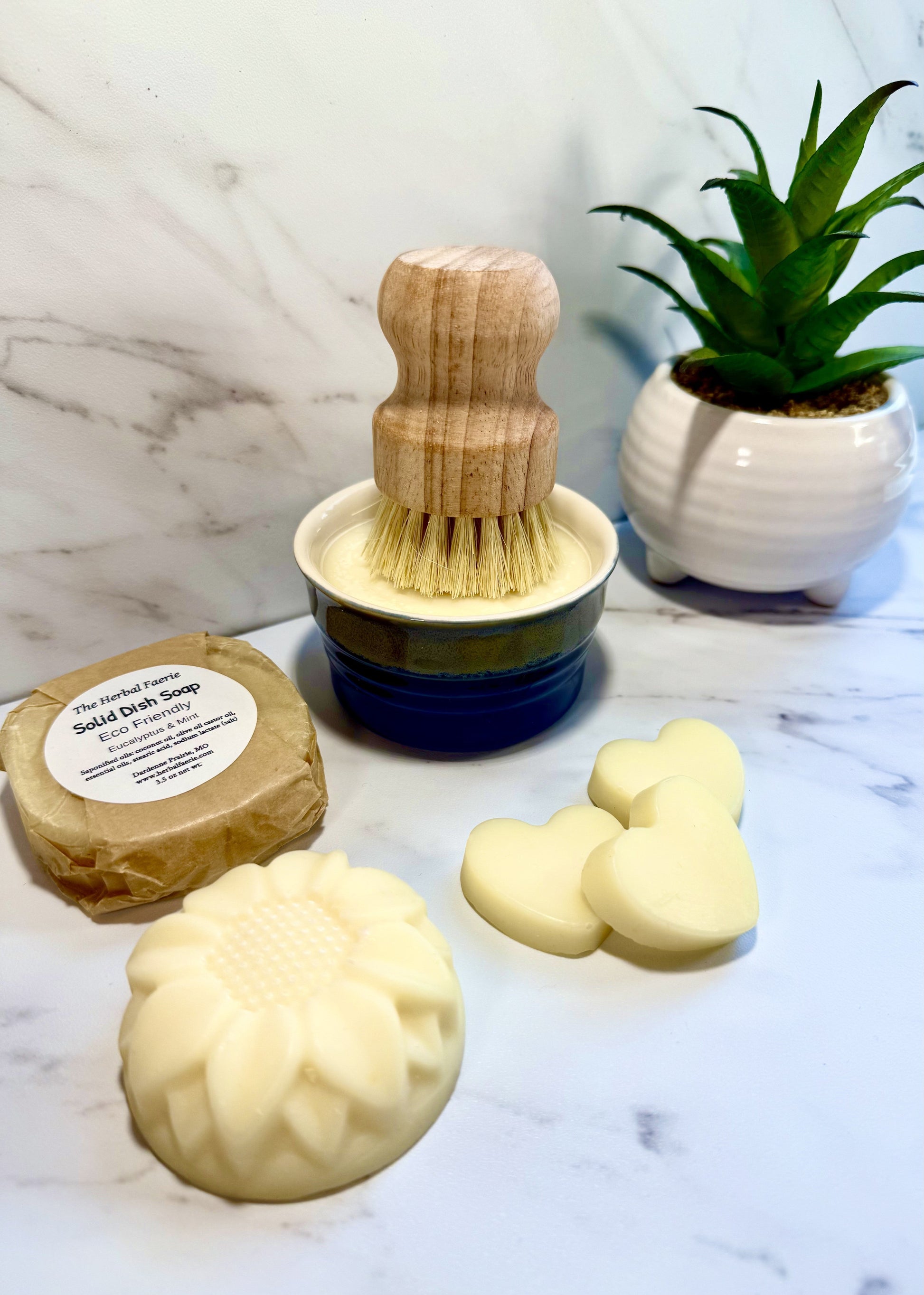 Our Solid Dish Soap harnesses the power of natural ingredients and essential oils to provide a fresh, effective clean that tackles grease with ease. Designed for hand washing a few items, its bubbly lather is gentle on fragile glasses and kind to your hands. Its very long-lasting formula ensures reliable performance, making it a beautiful choice for those seeking a natural and efficient dishwashing solution.